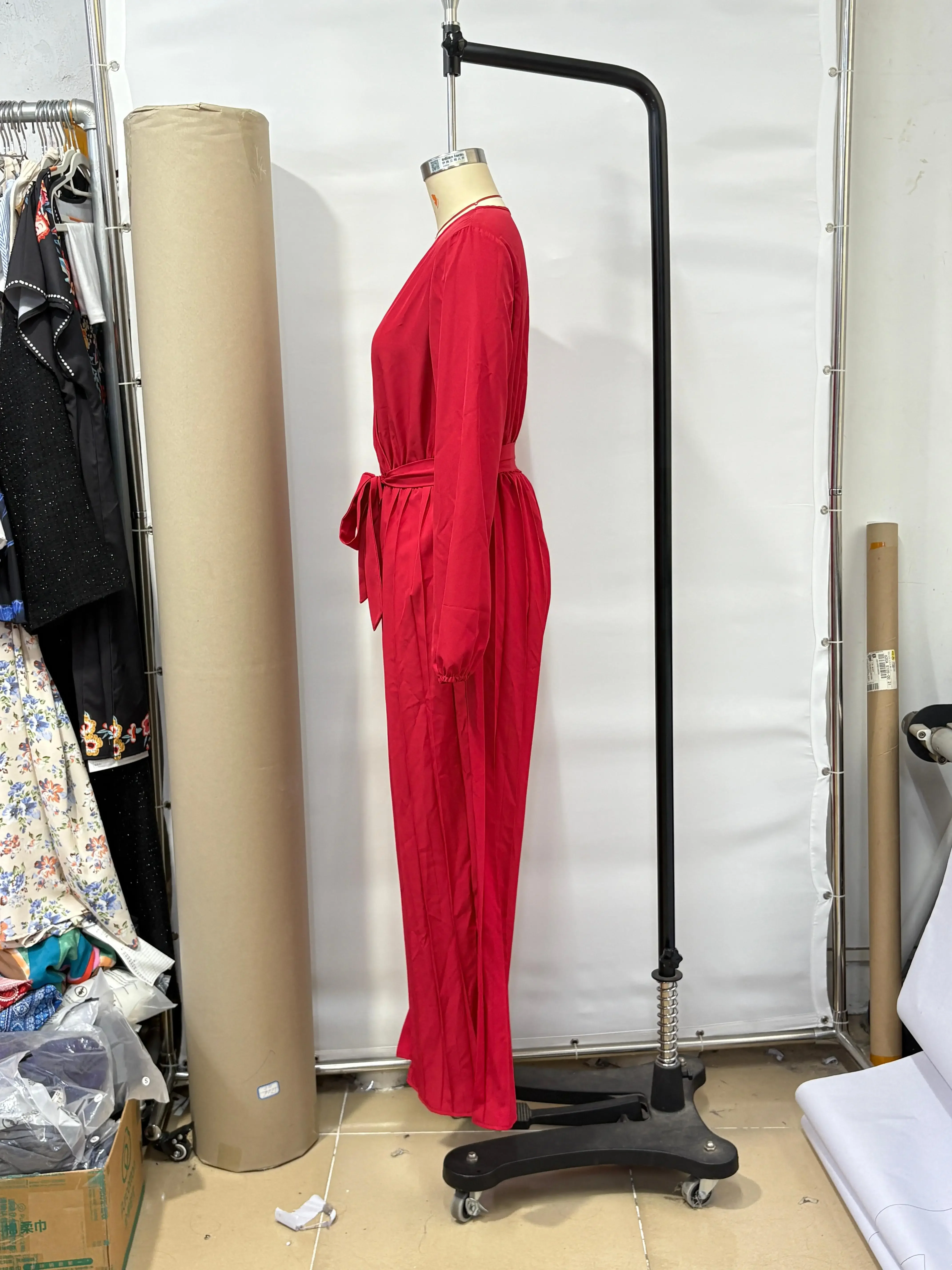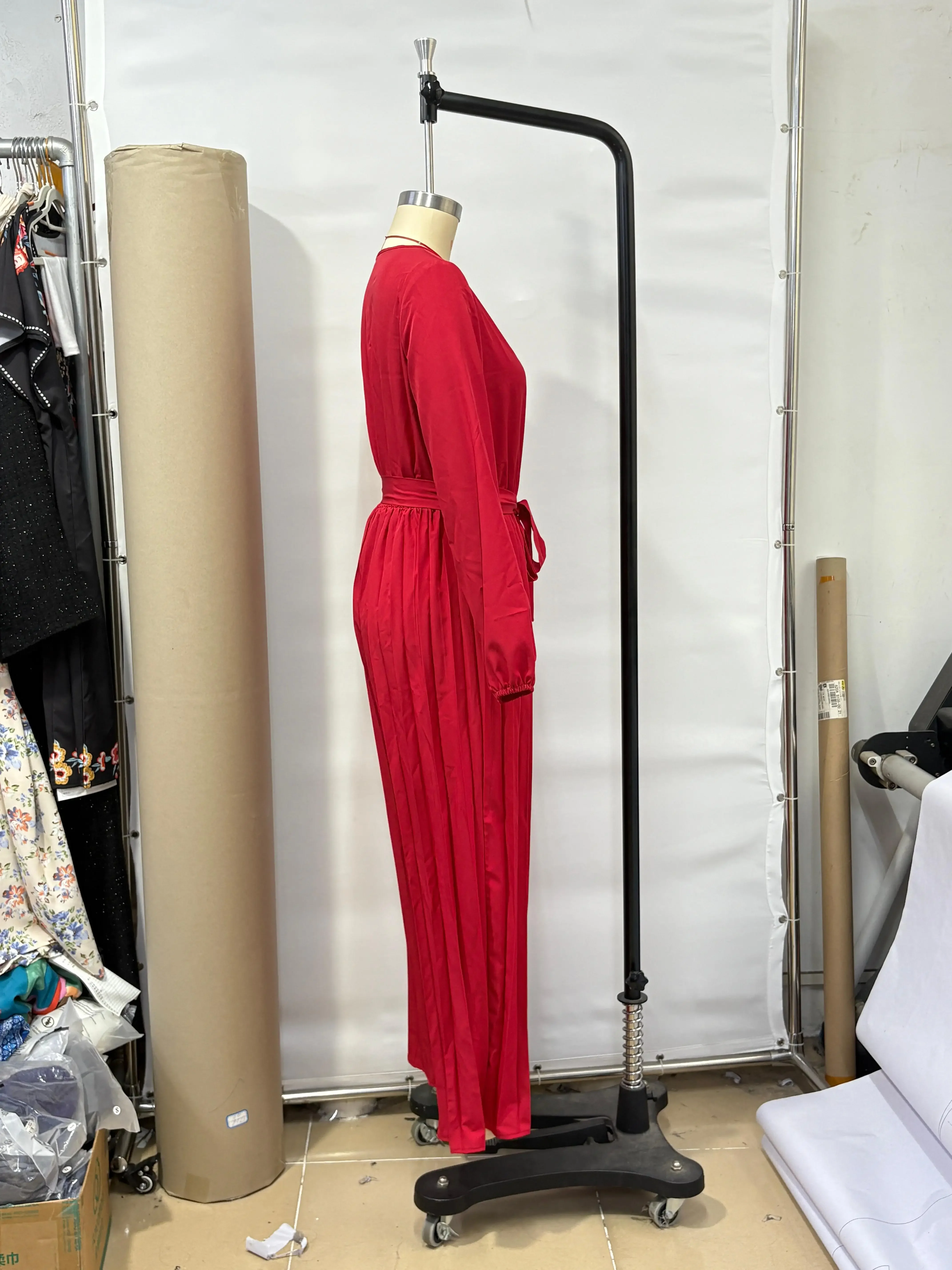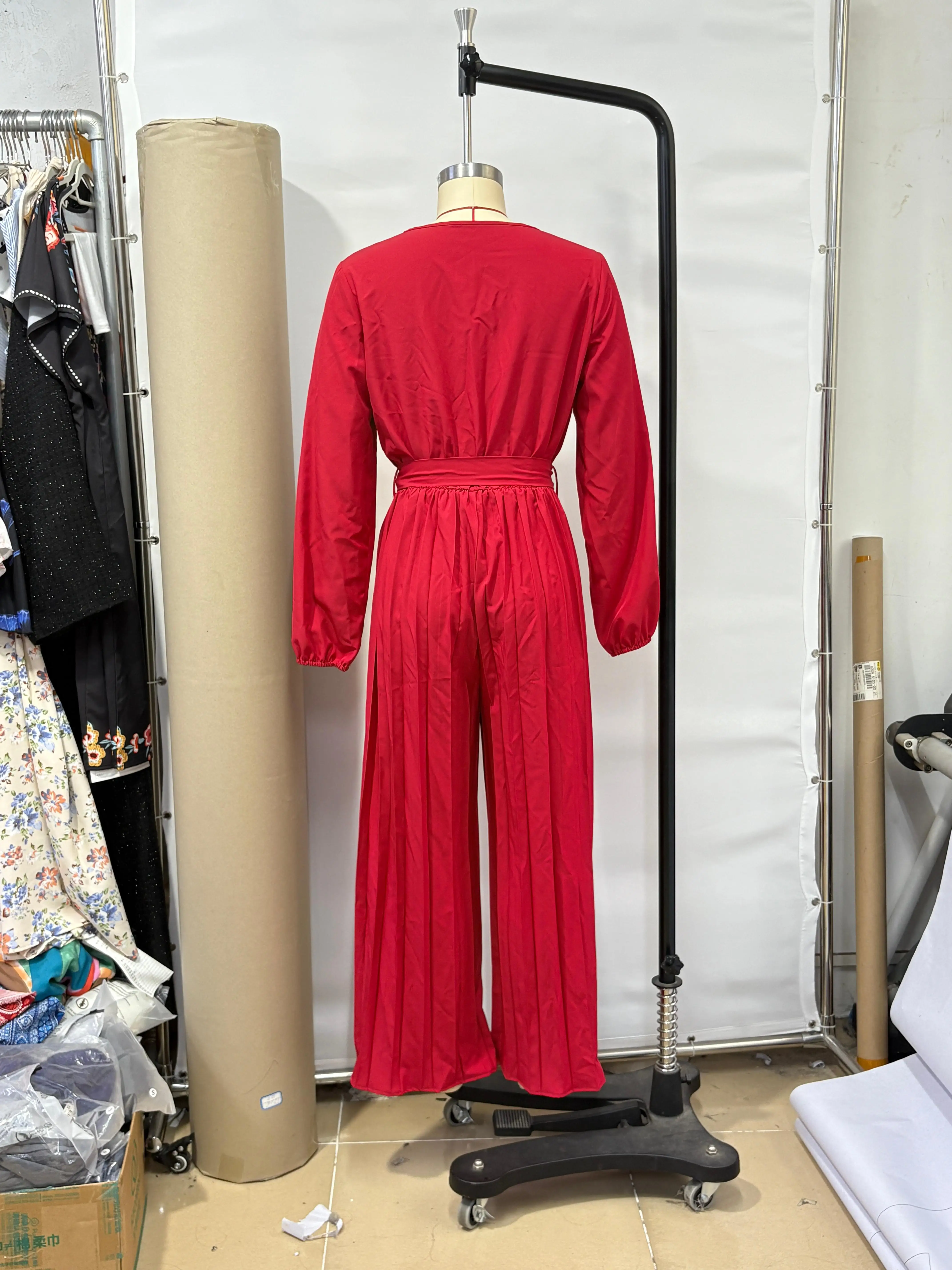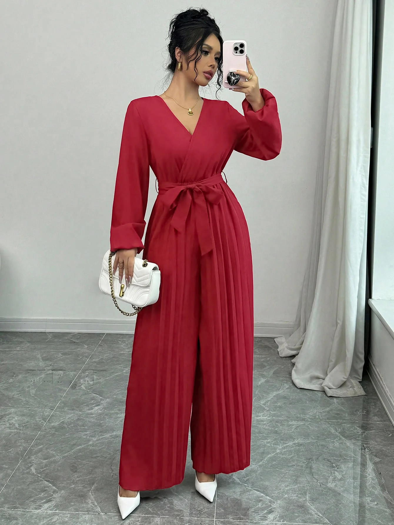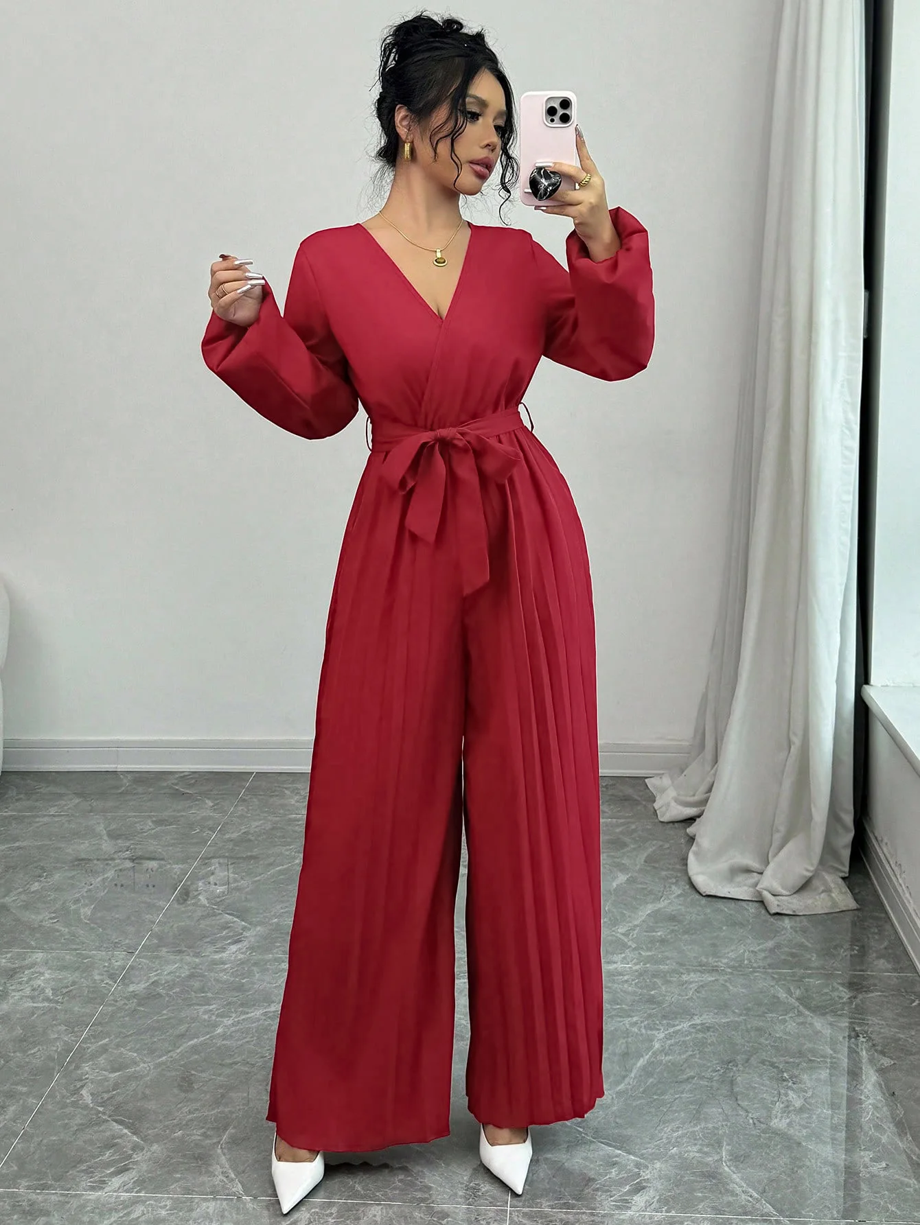 Jumpsuit Rompers for Women 2025 New Lace-up Casual Long Sleeve V-Neck Solid Elegant Wide-leg Jumpsuit Women Ropa De Mujer Q608